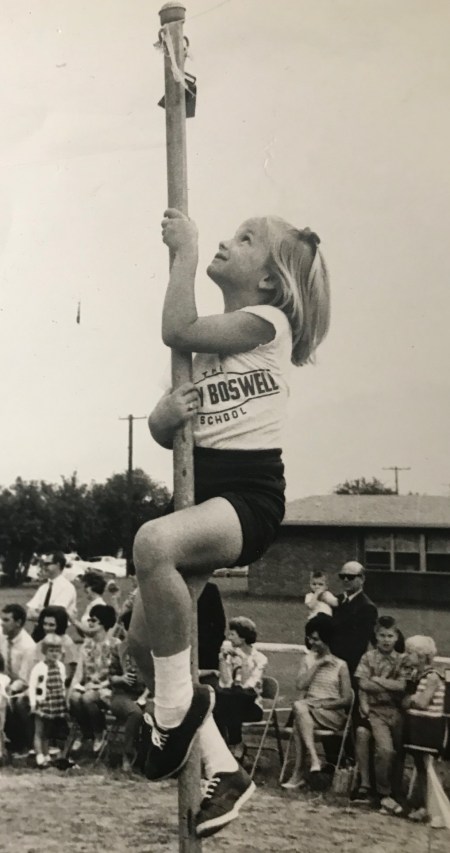 I look at that little girl and see her face filled with fear, pride and determination all at the same time. I was trying to reach a goal for the first time I guess. I wouldn’t have been climbing that pole except that it was a school thing. School inspired me to do all kinds of things I would not have done on my own…from climbing that pole to receiving a doctorate degree lots of years later from TCU.